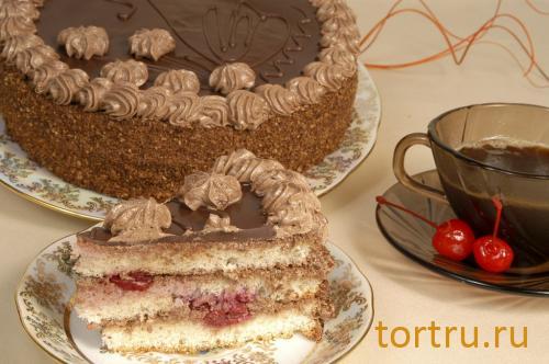 Описание: Слои бисквита пропитаны сиропом и соединены сливочно-шоколадным кремом с добавлением консервированной вишни, настоянной в коньяке. Поверхность торта покрыта и украшена сливочно-шоколадным кремом и шоколадной глазурью. Боковые стороны покрыты сливочно-шоколадным кремом и обсыпаны бисквитной крошкой.