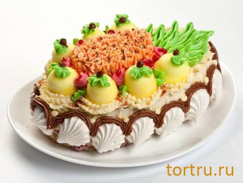 Отделка: сливочный крем, фигурка в виде ананаса из бисквита, фигурки в виде фруктов из белкового крема и помады, воздушный полуфабрикат.