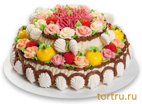 Отделка: сливочный крем, сливочный шоколадный крем, фигурки в виде фруктов из белкового крема и помады, воздушный полуфабрикат, полуфабрикат «клубничка».