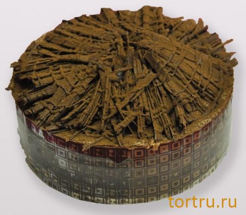 Нежный тонкий рулет пропитан сиропом с коньяком и прослоен шоколадным муссом. Украшен торт фигурным шоколадом в виде веера.