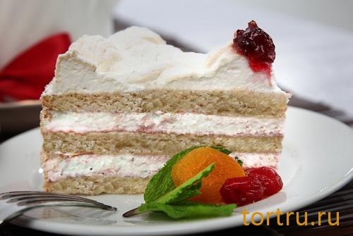 Слои песочного бисквита прослоены заварным белковым кремом с добавлением клюквенного джема. Торт украшен белковым кремом, сахарной пудрой.