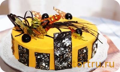 Белый бисквит промазан конфитюром "Абрикос", прослоен белыми и шоколадными сливками. Верх покрыт глазурью, оформлен шоколадом, цукатами вишни и глюкозой.