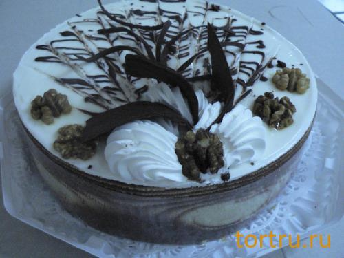 Два слоя бисквитного полуфабриката промочены сахарным сиропом, прослаиваются взбитыми сливками с добавлением цельного сгущенного молока, какао порошка и грецкого ореха. Боковая часть украшена взбитыми сливками и грецким орехом.