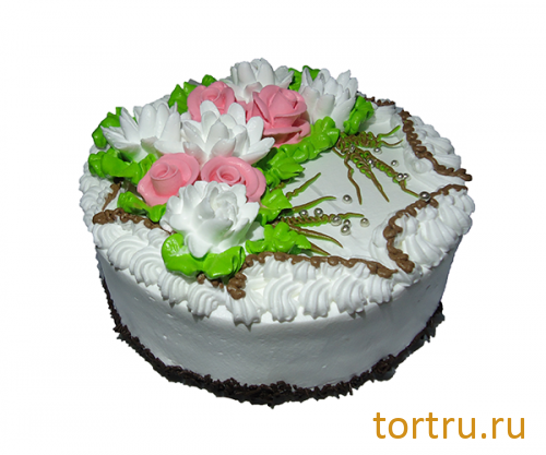 Белый бисквит, творожное суфле, сливочно-малиновый крем. Торт украшен сливками и шоколадом.