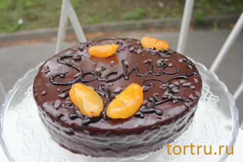 Шоколадный бисквит с начинкой из абрикосового джема, покрытый глазурью из молочного шоколада.