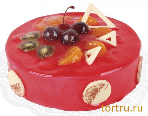 Описание: Нежный бисквит пропитан фруктовым сиропом с прослойкой сливок с добавлением вишневого джема. Украшен вишневой глазурью и фруктами.