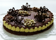 Это удивительный торт таит в себе сюрприз - это торт с начинкой из изюма и коньяка, бисквитной крошки и сливочного крема, помещенный в коробочку из бисквита. Вкус - настоящая изюминка.
