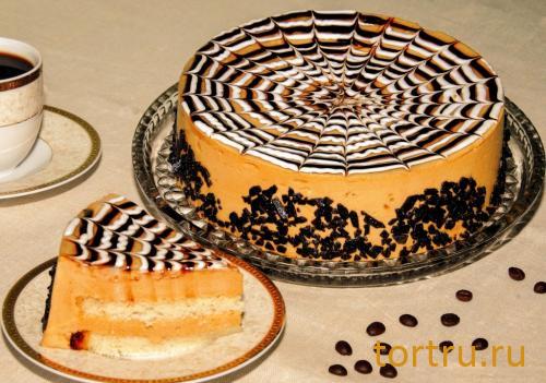 Описание: Слои бисквита соединены нежным суфле с добавлением вареной «сгущенки». Поверхность украшена разводами из шоколадного геля, боковые стороны обсыпаны шоколадной крошкой.