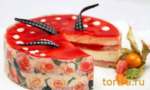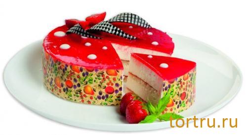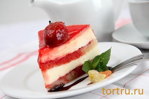 Слои классического бисквита соединены клубничным джемом, йогуртовым муссом. Торт украшен клубничным гелем, кондитерской глазурью.