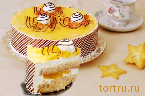 Описание: Слои шоколадного бисквита пропитаны густым сиропом и соединены фирменным кремом «Йогуртовый» с персиками. Украшена поверхность торта персиковым гелем «Декорфил» персиками, шоколадом и миндальными лепестками.