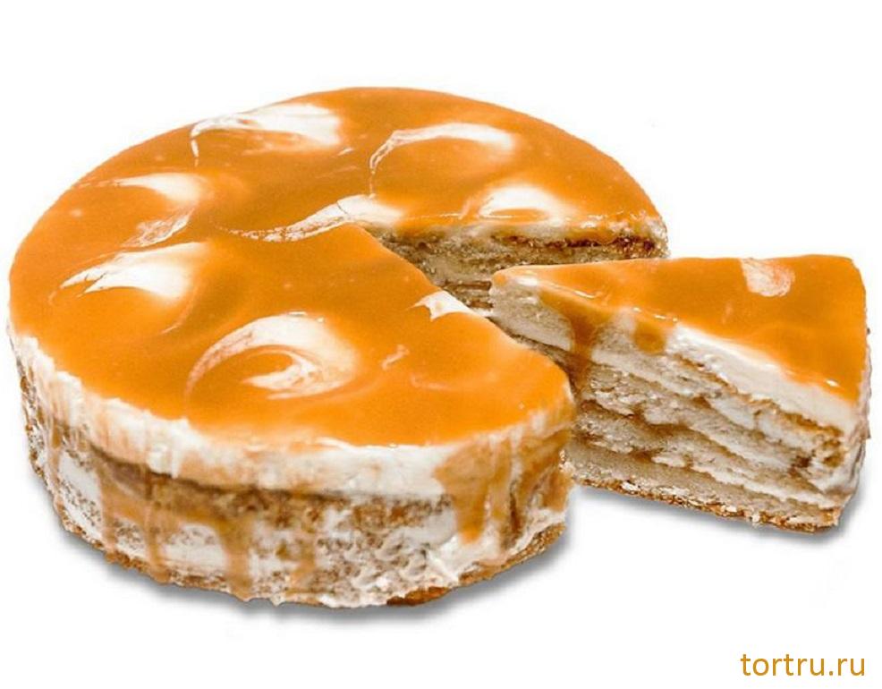 Масляные бисквиты, прослоенные карамельным соусом и заварным кремом. Поверхность торта украшена карамельным соусом.