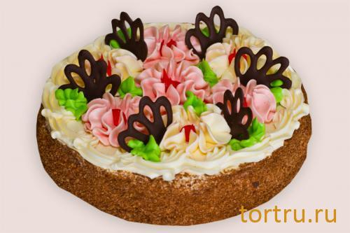 Слои нежного бисквита пропитаны коньячным сиропом и соединены шоколадно-сливочным кремом с вареным сгущенным молоком. Украшен шоколадными узорами.
