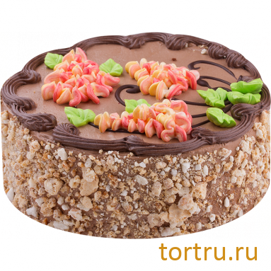 Белково-ореховые коржи с фундуком и арахисом, сливочный крем, оформлен шоколадным кремом.