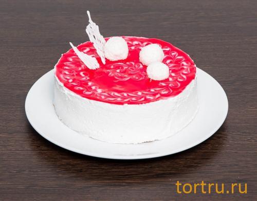 Приятный клубничный торт с нежным творожным муссом и тонким витиеватым узором в оформлении. Доставьте удовольствие себе и друзьям!