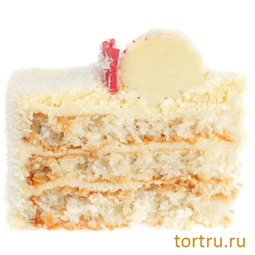 Коксовый бисквит пропитанный кокосовым сиропом с прослойками из кокосового мусса с кокосовой обсыпкой – это настоящее райское наслаждение.
