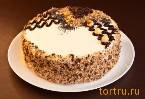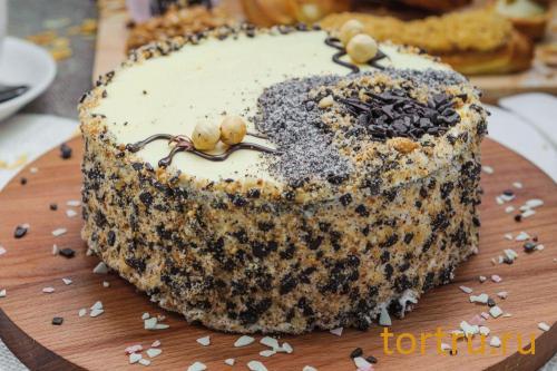 Трехслойный торт на базе масляного бисквита с добавлением мака, грецкого ореха и шоколадной крошки. Прослоен сливочно-сметанным кремом.