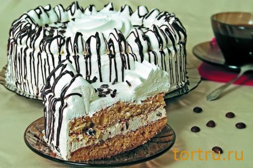 Описание: Два слоя медово-песочных коржей пропитаны густым сиропом и соединены взбитыми сливками с добавлением меда и чернослива. Торт покрыт взбитыми сливками и украшен шоколадом.