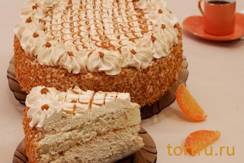 Описание: Слои бисквита пропитаны густым сиропом и соединены кремом «Крем-брюле», боковые стороны обсыпаны воздушным рисом с карамелью. Поверхность  торта украшена кремом «Крем-брюле».