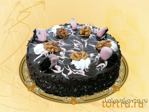 Бисквит, сметанный крем, чернослив, грецкий орех, мягкий шоколад, шоколадная посыпка