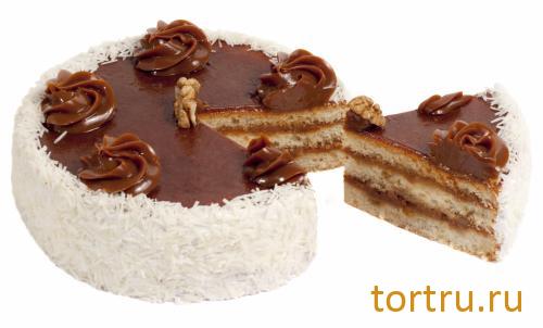 Три слоя белого бисквита пропитаны сиропом и прослоены уваренным сгущенным молоком с грецким орехом. Поверхность торта украшена уваренным сгущенным молоком, грецким орехом и шоколадной глазурью.