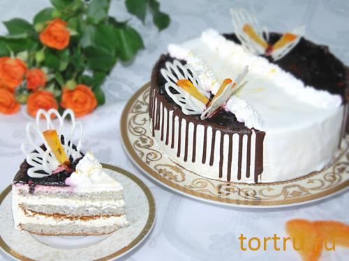 Состав: Сметанный бисквит с какао и грецк., орех., сливки,  коньячная пропитка, коктельная вишня.