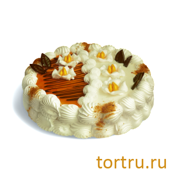 Описание: Белые бисквиты прослоены апельсиновой начинкой и кремом из взбитых сливок. Бока оформлены взбитыми сливками. Торт украшен сливковым кремом и шоколадной глазурью.