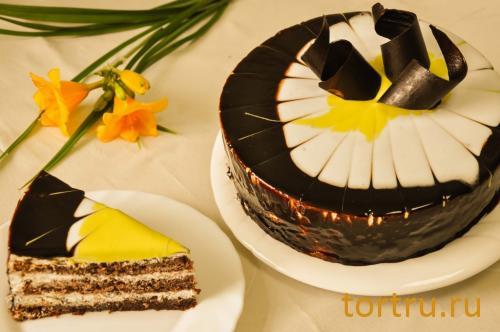 Описание: Слои шоколадного бисквита соединены сливками с добавлением абрикосового джема с тертым шоколадом. Поверхность торта и боковые стороны покрыты цветными гелями и украшены шоколадным декором.