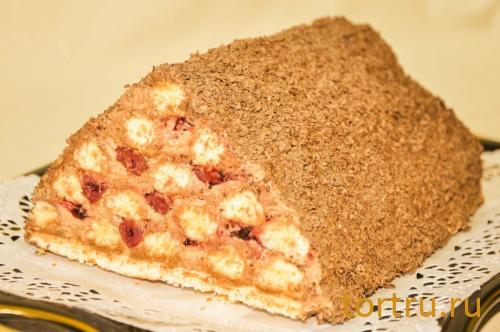 Описание: Песочные «бревнышки» склеены шоколадными сливками с вишневой прослойкой, «крыша» обсыпана шоколадной крошкой.