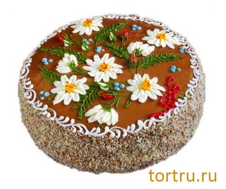 Медовые коржи прослоены вареным сгущенным молоком. Боковая часть торта обсыпана бисквитной крошкой. Оформлен цветами из крема. Серия домашних тортов.