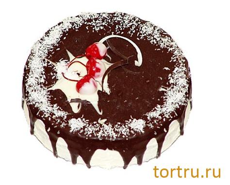 Три сметанного бисквита с какао и два сметанного бисквита с орехом, прослоены кремом из сливочного масла с добавлением сгущенного молока. Оформлен белой и черной шоколадной глазури, вишенками. Серия домашних тортов.