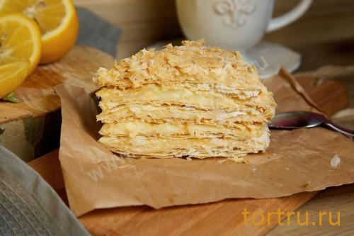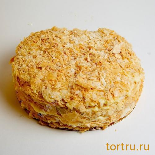 Пять коржей слоёного полуфабриката смазаны заварным кремом, который готовится на натуральных сливках 35 % жирности с добавлением сливочного масла, яичных желтков, сахарной пудры. Поверхность обсыпана крошкой этого же полуфабриката.