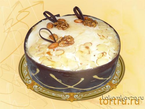 Бисквит, сливочно-ванильный крем, сироп, изюм, грецкий орех, миндаль, шоколад