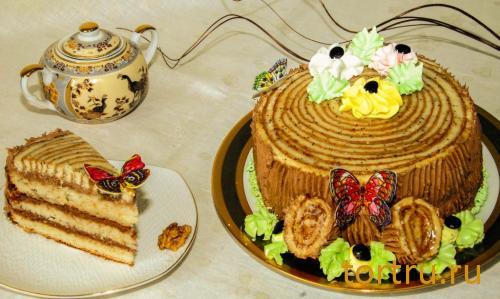 Описание: Слои бисквита пропитаны коньячным сиропом, соединены кремом на сливочном масле с шоколадной пастой. Поверхность украшена маковым рулетом с гелевым покрытием, грибочками, вафельными бабочками.
