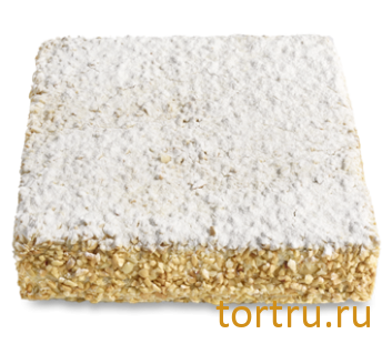 Слои бисквита с пропиткой, соединены сливочным кремом. Торт посыпан сахарной пудрой и дробленым орехом.