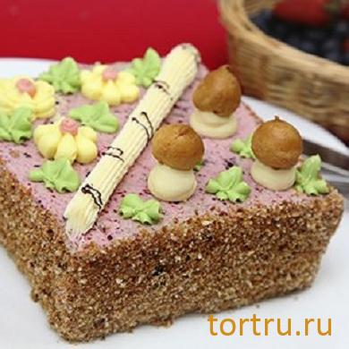 Слои классического бисквита пропитаны сиропом, прослоены сливочным кремом с джемом. Торт украшен сливочным кремом, фигурками в виде грибов из заварного полуфабриката.