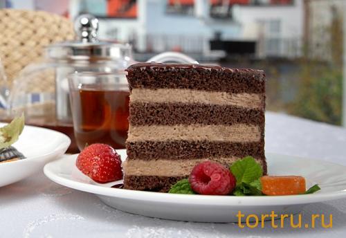 Слои шоколадного бисквита соединены шоколадным кремом. Торт украшен глазированной шоколадной помадкой.