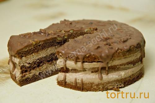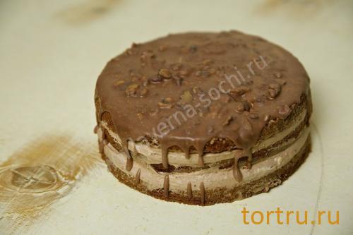 Состав «Пражского» торта: шоколадный бисквит, крем заварной с шоколадом и маскарпоне, покрыт шоколадно-ореховым гляссажем