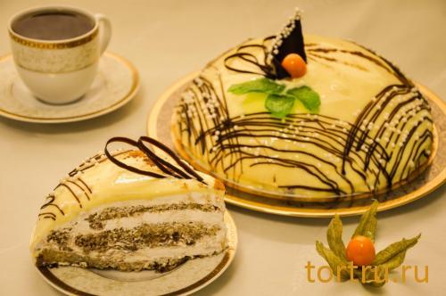 Описание: Слои сметанного бисквита прослоены начинкой яблочной с корицей, соединены сливками с добавлением «кондитерской сгущенки», облиты желеобразной глазурью «Армони». Торт имеет форму полусферы с нанесенным шоколадным рисунком, украшен шоколадным декором, цукатами, физалисом, перламутровым драже.