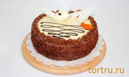 Карамельный бисквитный полуфабрикат склеен сметанным кремом и полит белым ганашом.