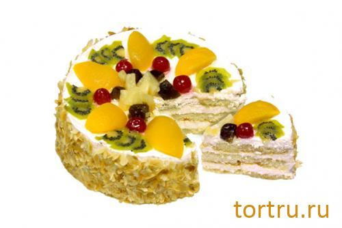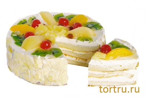 Киви, груши, персики, сливочный крем с абрикосовым джемом и нежный бисквит, пропитанный сиропом для любителей фруктов.