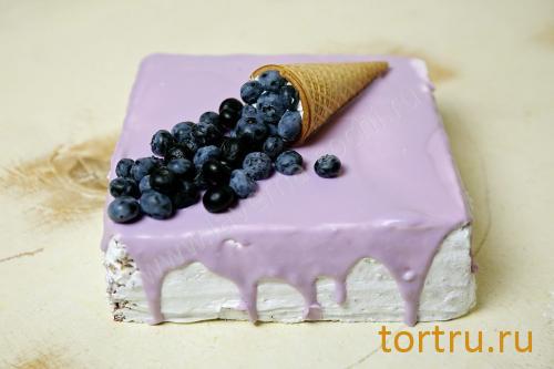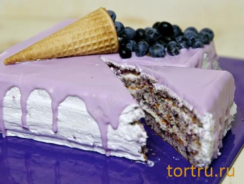 Бисквит из чёрной смородины, сметана с маскарпоне, гляссаж шоколадный и свежая голубика.