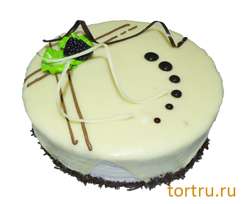 Белый бисквит с фруктово-ликерной пропиткой. Крем йогуртовый со сливками и консервированными фруктами. Поверхность торта покрыта белой глазурью с кокосом и оформлена шоколадом и желейным мармеладом.