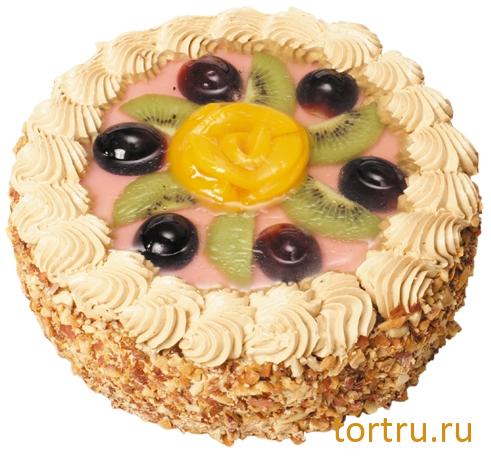 Сладкий сувенир из детства. Кефирный бисквит, пропитанный сиропом, вишнёвая начинка, крем из варёной сгущёнки, дроблёный арахис и украшение из фруктов в ароматном желе. Приятное воспоминание, долгое чаепитие