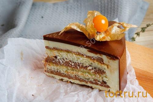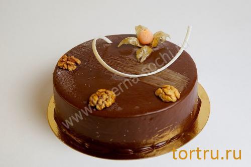 Все эти слои залиты шоколадно-сливочным муссом. Поверхность залита шоколадно-сливочной глазурью и украшена грецкими орехами и плодами физалиса, шоколадного декора.