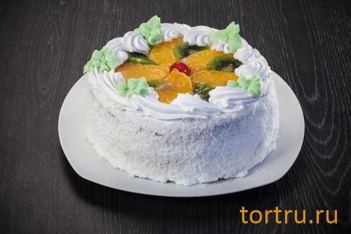 Состав: бисквит, сливки, фрукты, кокосовая стружка, сироп