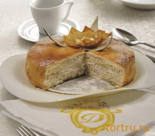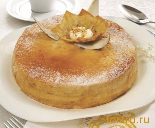 Слои блинов соединены сметанным кремом. Верхняя и боковые поверхности торта заглазированы карамельным гелем. Верхняя поверхность украшена пудрой сахарной, крошкой из грильяжа, фигурками из кондитерской глазури и корзинкой из блинных чипсов со сметанным кремом внутри.