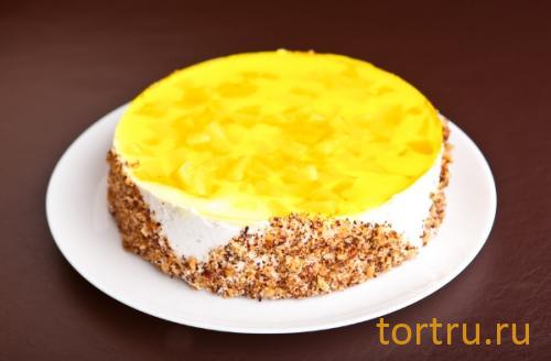 Бисквит, йогуртовое суфле, консервированные персики и ананасы.