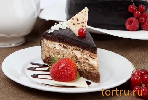 Бисквит с какао и воздушно-ореховый п/ф прослоены шоколадным кремом. Поверхность торта покрыта ганашом и украшена кондитерской глазурью, декоративной посыпкой.