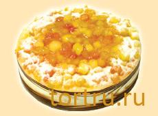 Нежные слои бисквита соединены начинкой из ананаса, персика, папайи и творожным кремом, верх выложен свежими ананасами, папайей и персиком, которые залиты желе.