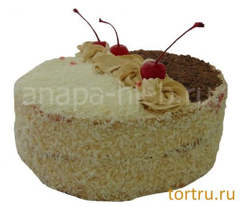 Вишня, молоко сгущенное варенное с сахаром, сливки растительные, яйцо куриное, сахар-песок, глазурь шоколадная, эксклюзивная сухая кондитерская смесь, мука пшеничная хлебопекарная высшего сорта, настойка «Вишня на коньяке», кокосовая стружка, цукаты, крахмал картофельный, вода, пудра сахарная, какао, эссенция ромовая, желатин.
